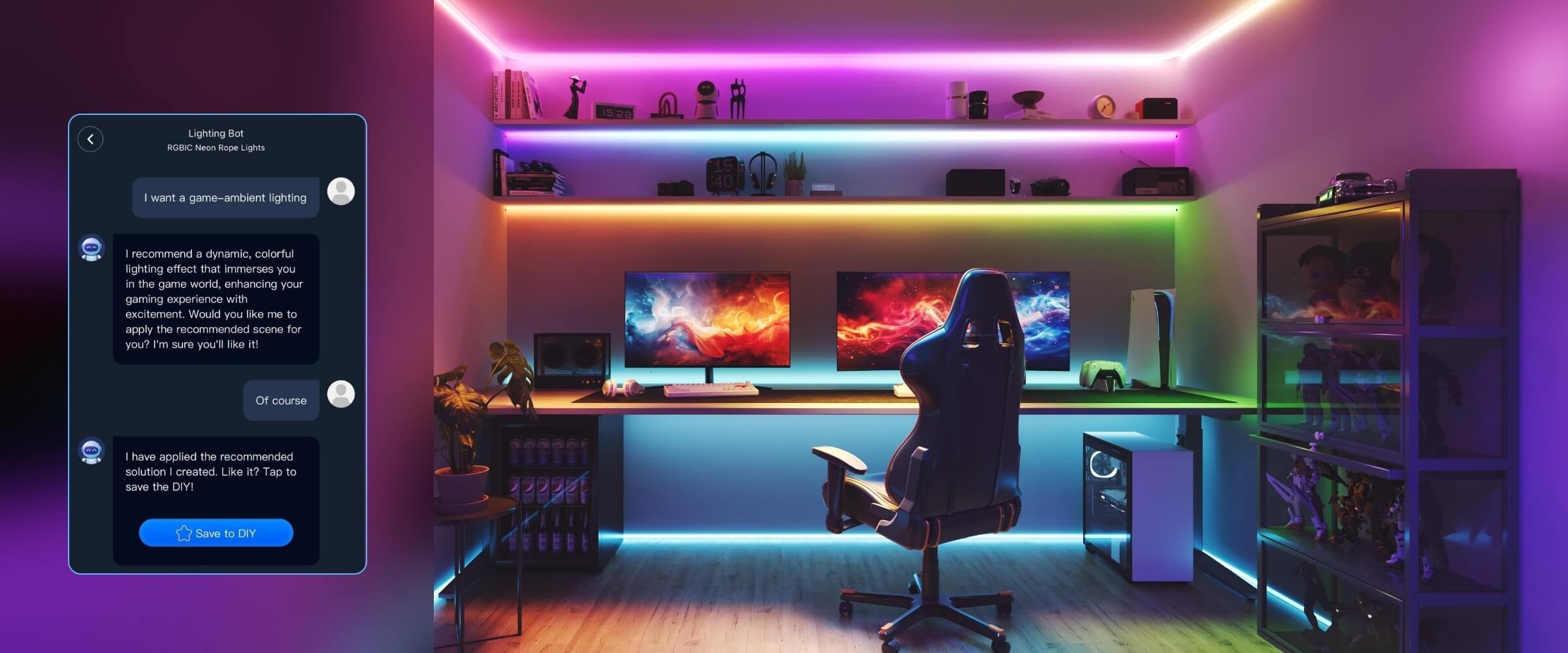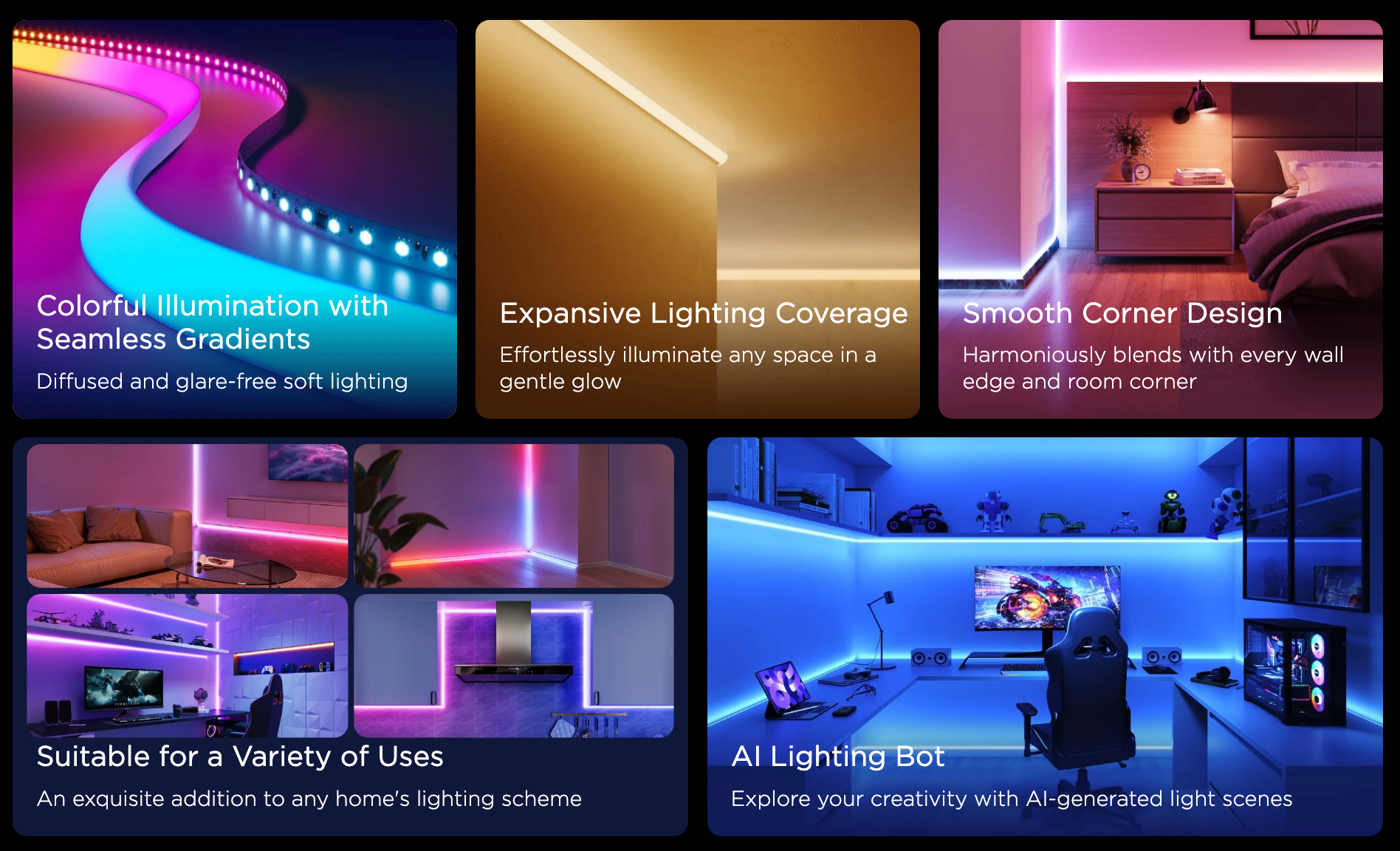 • 人工智慧照明機器人:我們的人工智慧照明機器人由 AIGC 和先進的人工智慧演算法提供支持,可分析您的文字和語音提示,以立即產生適合您的興趣和事件的新場景。