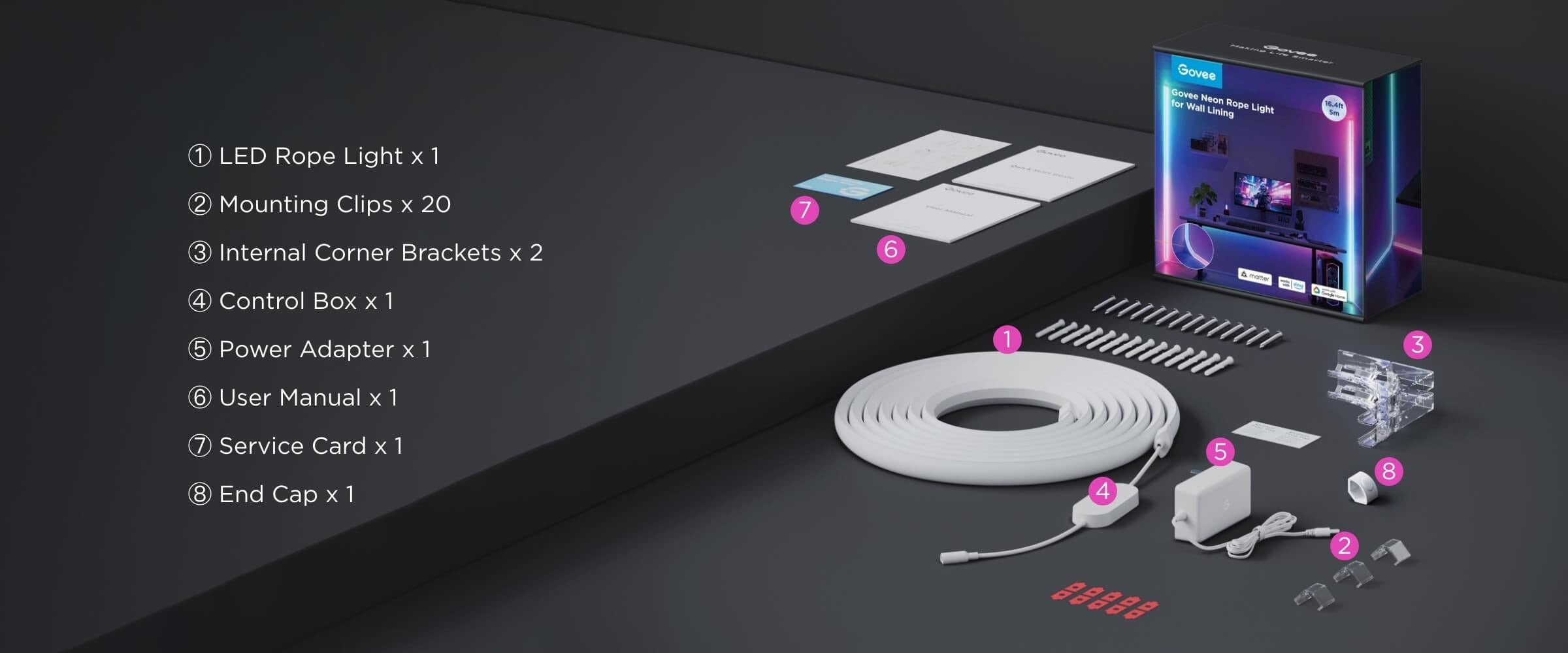 • 輕鬆語音控制:與 Google Assistant 和 Alexa 以及適用於第三方系統的 Matter 相容。您可以透過語音調整燈光,並且包含 99 多個預設場景,可滿足任何心情。請注意,霓虹燈繩不支援 5G Wi-Fi。