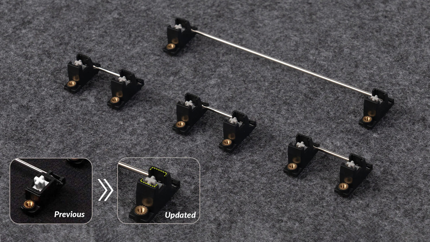 我們升級的穩定器現在在閥桿周圍具有加固的側壁,提供額外的保護並顯著提高穩定性。這些「牆」在開關和鍵帽之間建立了更牢固的連接,確保在空白鍵、Shift、Enter 和刪除等大按鍵上進行更順暢、更可靠的打字。