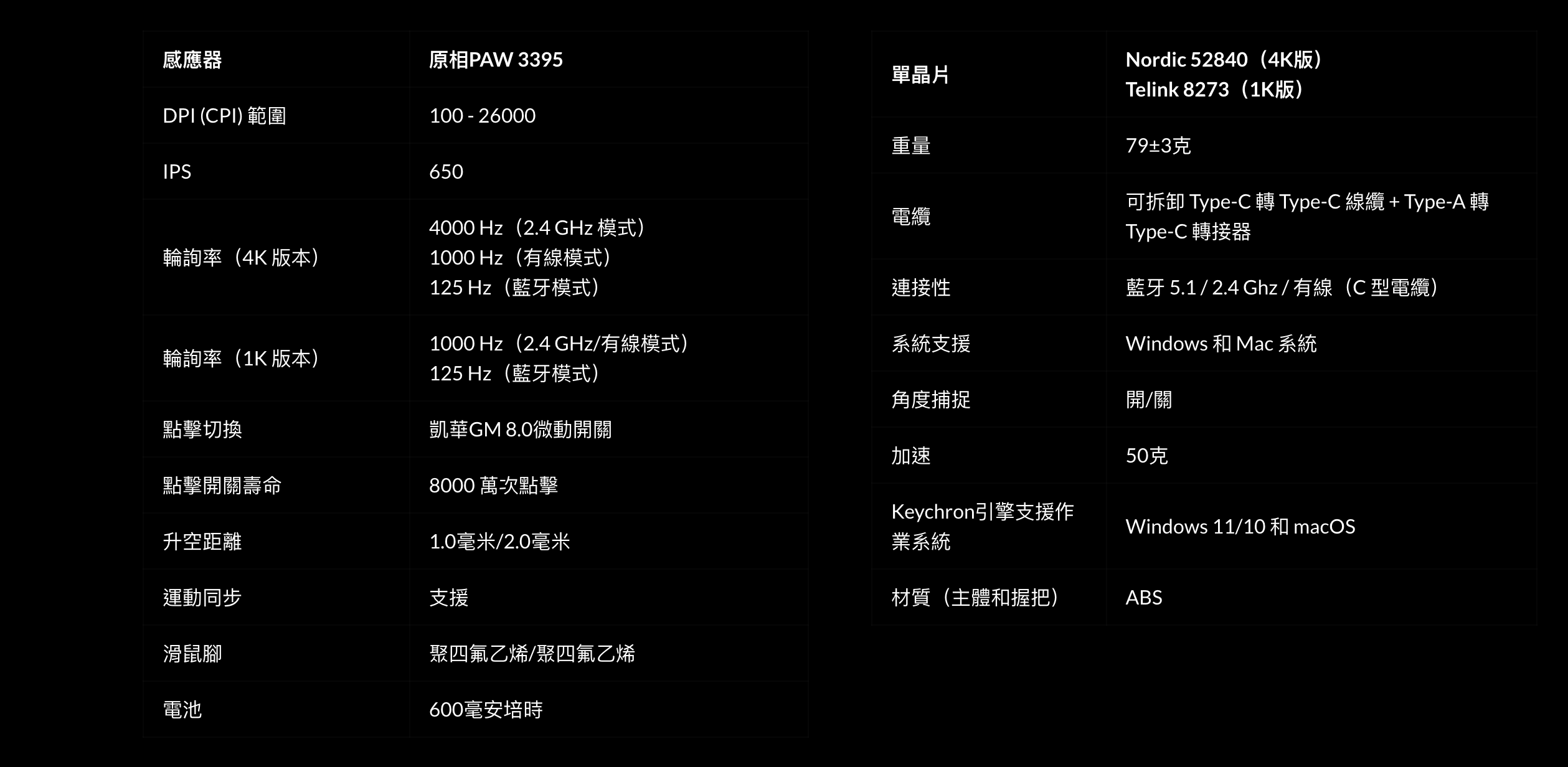 M3擁有最強、最具競爭力的級滑鼠感應器晶片PAW3395,高達26,000 DPI,高達650 IPS,以及無與倫比的握持精度。無論是工作還是遊戲,M3 都能提供無與倫比的體驗。