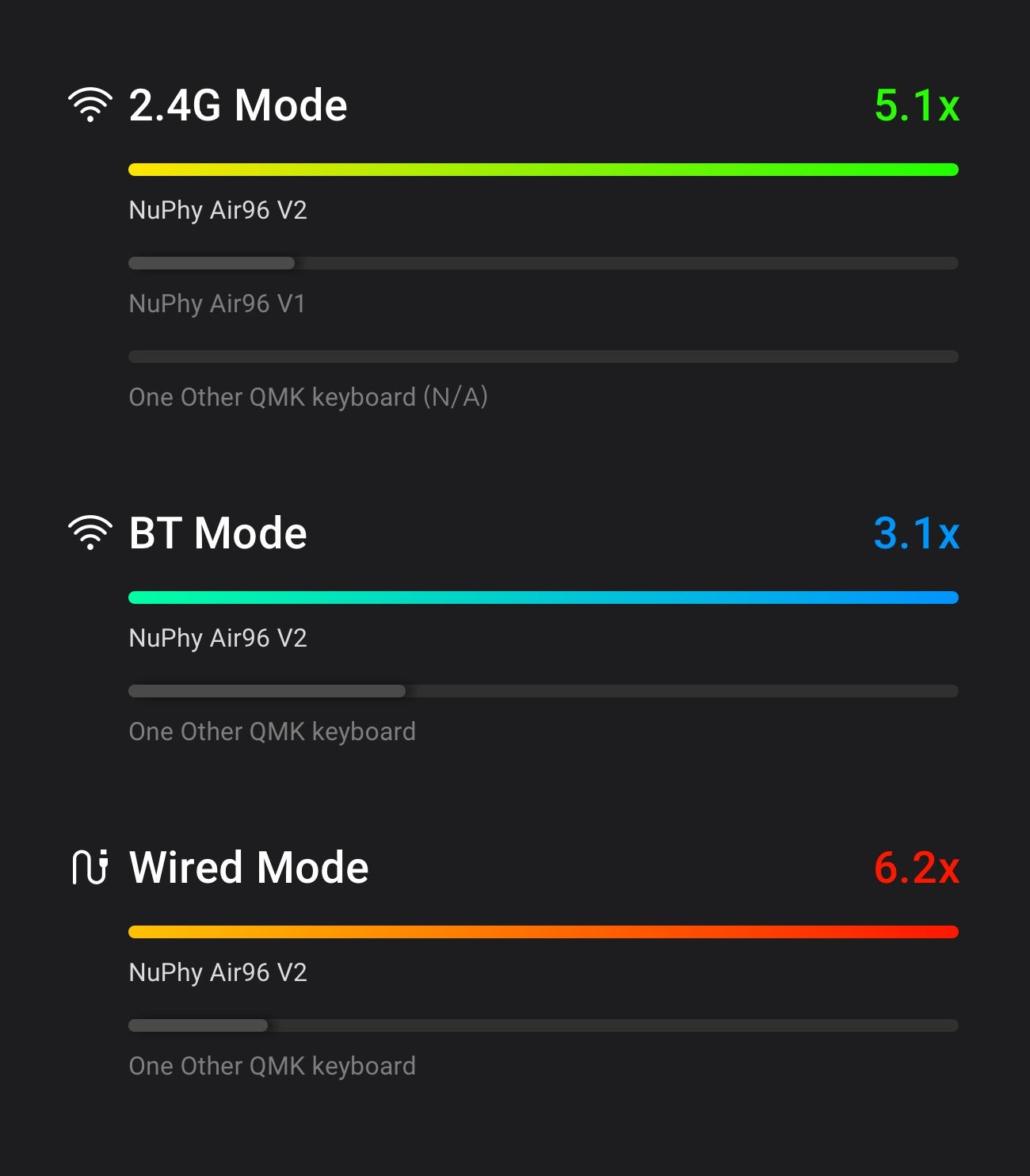 數字告訴我們真相。 我們針對新款 Air96 的延遲效能對其前身和另一款基於 QMK 的鍵盤進行了一些基準測試。 可以說,我們都對結果感到震驚,並很高興一勞永逸地結束了薄型鍵盤不適合專業遊戲和低延遲應用程式的神話。