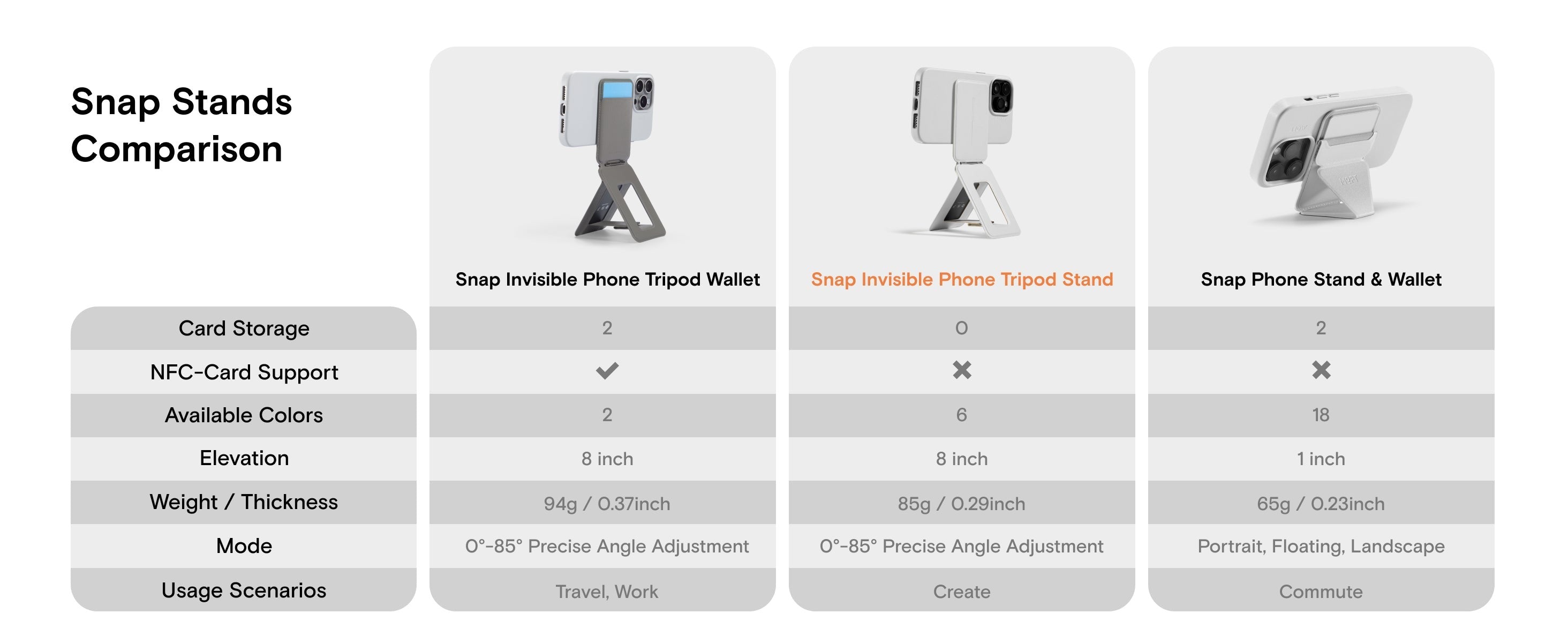 遵循 MOFT 的設計理念,攜帶時看不見、摸不著、不被注意,而且堅固耐用,可將手機相機提升至 8 英寸高。