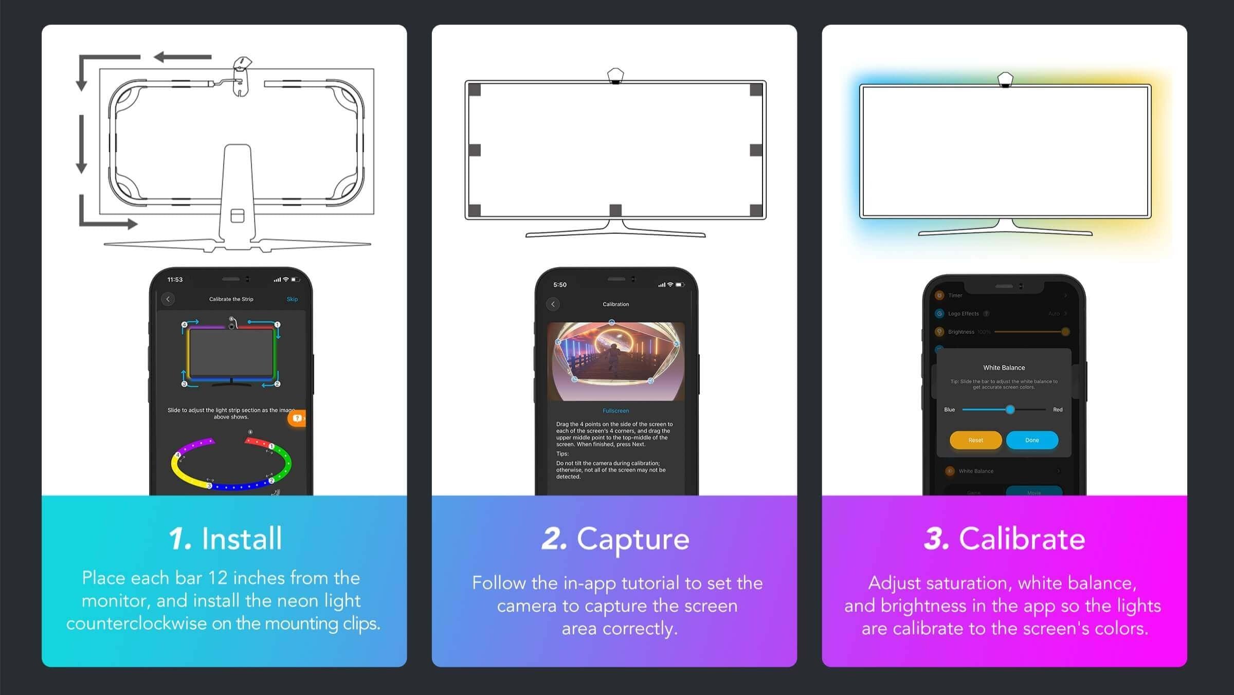 為了確保您完全身臨其境的體驗,霓虹燈帶必須是應用在顯示器上平坦的後面板(升高的階梯會影響安裝夾的安裝)